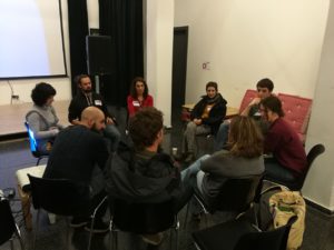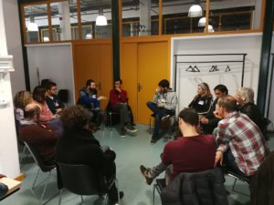 Tot seguit breu presentació del poble de Salt a càrrec del regidor de Joventut, també l’àrea de joventut de Salt i el propi Projecte d’ateneu, on vam explicar el procés de més de 5 anys de lluita per aconseguir un espai com aquest, un espai de gestió comunitària que és dels primers lluny de Barcelona, ja sols quedava explicar quins grups de treball s’havien creat a partir de les inquietuds que la gent havia deixat penjades. Així quedaven els 8 grups, 4 per la primera ronda i 4 més per la segona després de parar per esmorzar: