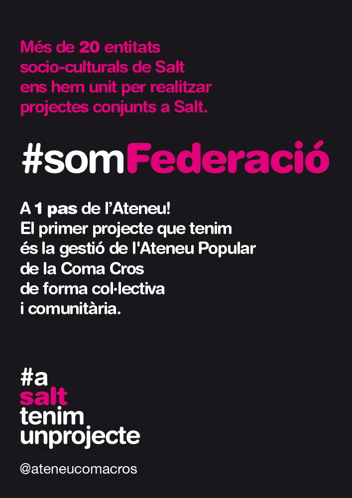 D’aquesta manera es dóna forma jurídica a un grup d’entitats que volen treballar conjuntament per a la vila i que tenen com a primer objectiu gestionar l’espai de l’Ateneu Coma Cros. És la primera vegada a Salt que es crea una federació amb un gruix tan significatiu d’entitats del sector social i cultural. El procés de treball que s’està portant a terme des de fa tres anys entorn el projecte de l’Ateneu ha propiciat la creació d’aquesta federació per la necessitat de crear vincles i treball comú entre les entitats per tirar endavant projectes comunitaris.